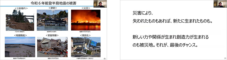 能登の現状は能登官民連携復興センターの杉本拓哉さん(石川県創造的復興推進課)が報告。「災害によって失われたものもあれば、新たに生まれたものもある」と、復興を通じて生まれた取り組みを評価しています。震災前から高齢化が進んでいた能登の地域を「もともと持続可能な状況ではなかった」と分析し、だからこそ「もとに戻すだけではない『創造的復興』が大切」と力を込めます。
