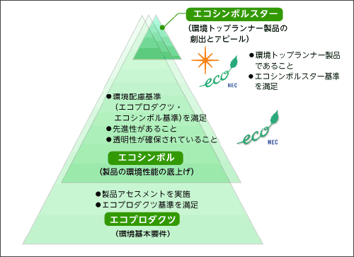 NECでは、自社の環境配慮基準を満たす環境配慮型製品とソフトウェア/サービスを3階層に分けて認証・登録しています。