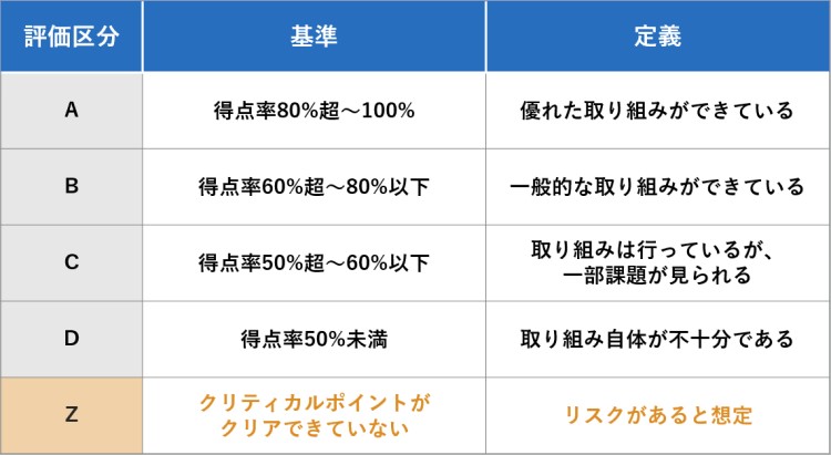 2024年度の点検では、協力を依頼したTier1にあたる1,354社のうち1,206社から回答を得るとともに、調達取引先の取り組み状況を「得点率」および「クリティカルポイント*2」の評価基準に基づいて「人権」「安全衛生」「環境」「公正取引」「その他」の点検テーマ単位にA、B、C、D、Zの5段階で評価しました。