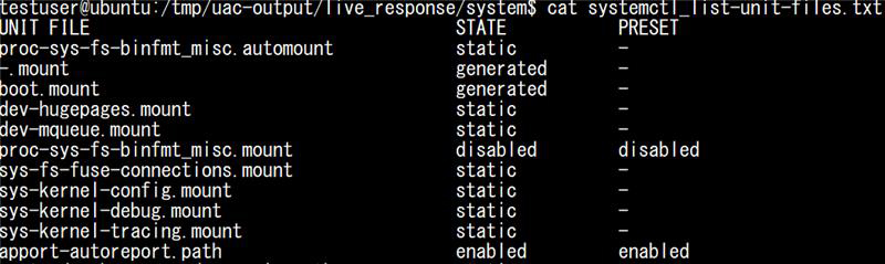 例として、live_response/system配下にあるsystemctl_list_unit-files.txtというファイルを見てみると、systemctl list-unitsコマンドの出力結果がそのまま出力されていることが確認できます。