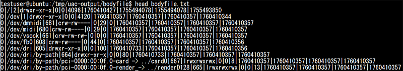bodyfileフォルダにはbodyfile.txtというstatコマンドの実行結果が格納されます。このbodyfile.txtには/proc、/procfsフォルダを除いたすべてのファイルのメタデータが出力されます。