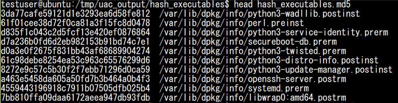 hash_executablesフォルダには、/proc、/procfsを除き、実行権限が付与されているすべてのファイルのSHA1とMD5のハッシュ値が出力されます。