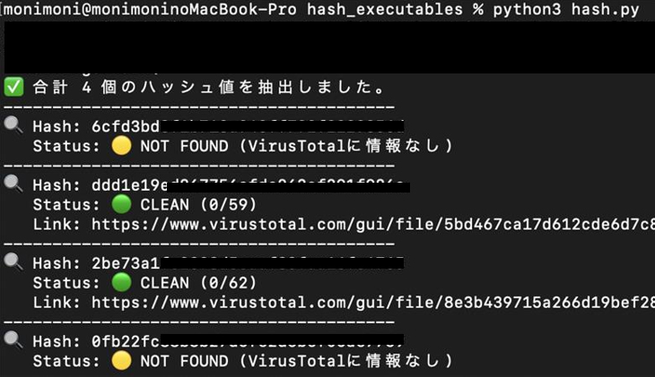 [4]などのマルウェアDBと照合することで、システム内に存在する既知のマルウェアや攻撃ツールを特定することが可能です。今回は例としてVirusTotalのAPIを使用して、ハッシュ値をVirusTotalで検索するスクリプトを作成し、検索したハッシュ値を持つファイルが悪性判定されるかを確認しました(なお、VirusTotalは無償版だと1日上限500回、1分で4回のAPI制限があることに注意が必要です)。
