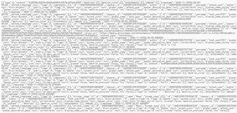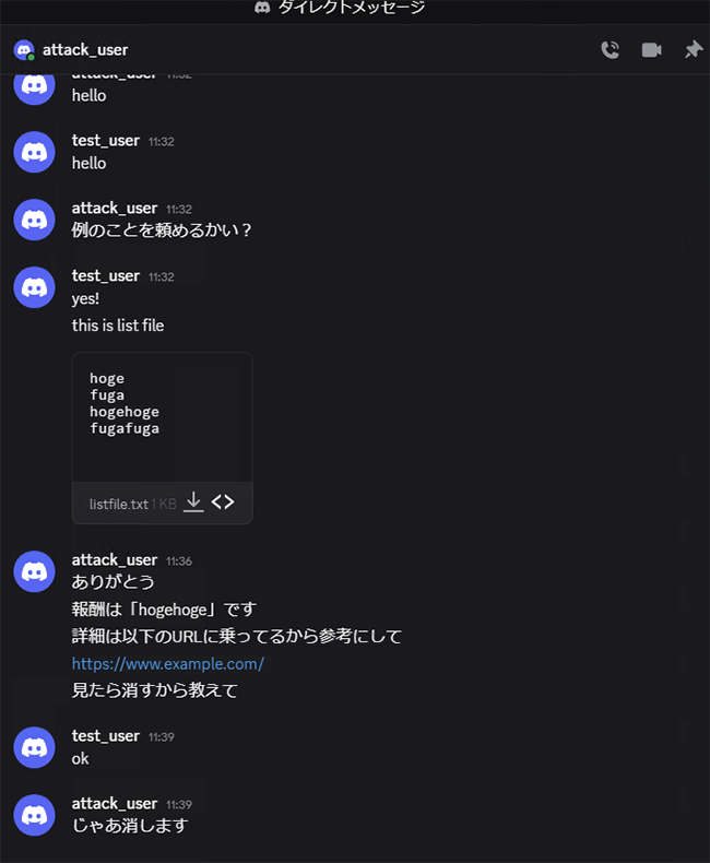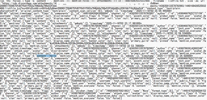 調査により今回のDiscord上での会話は次のような流れであったことが分かりました。([ ]内は「content」フィールドに保存されていたメッセージ本文を示しています)