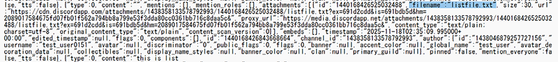 「listfile.txt」が含まれている箇所の前後にある「content」のタグなどのフィールドを確認します。「content」はユーザが送信したメッセージを表すフィールドです。