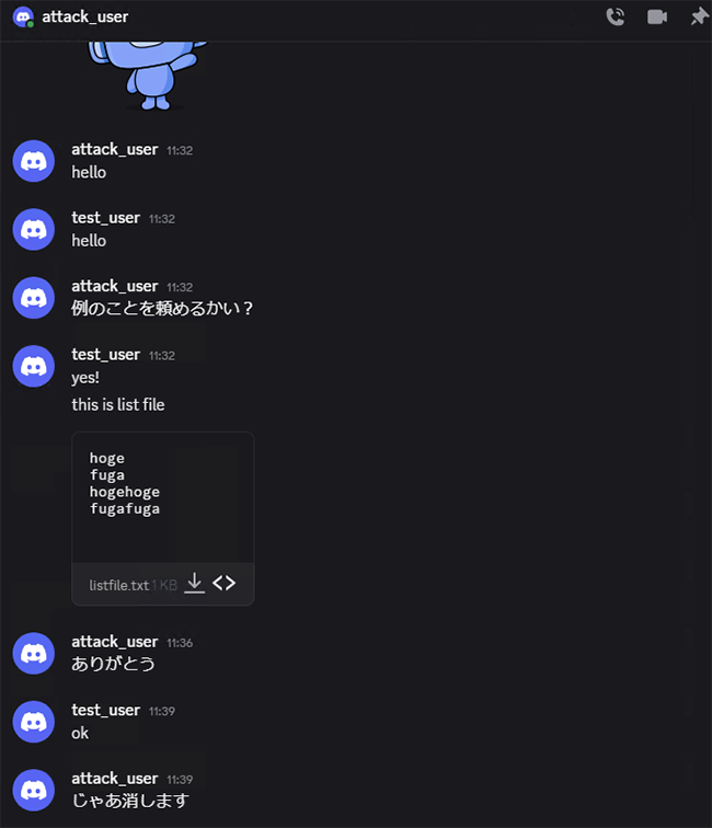 これらの調査結果を踏まえて、実際に検証環境で送受信したDiscordメッセージ画面を示します。図8は実際にやり取りしたメッセージ画面、図9は一部メッセージを削除した後の画面です。
