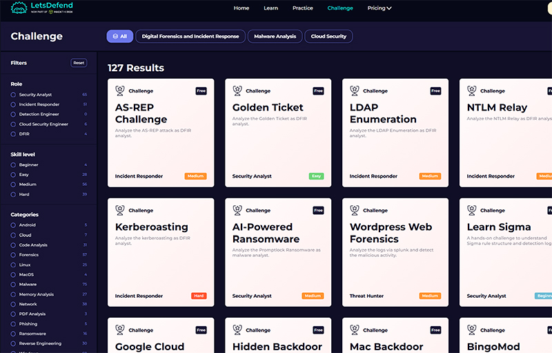 LetsDefendは、アラートトリアージ、ログ解析、フィッシング調査、マルウェア解析などの様々な防御側の領域を擬似体験できるブルーチーム特化型のトレーニングプラットフォームです。例えば、SOCのアラート処理の流れを学べる「Practice」や、ログを見ながら一問一答形式で調査していく「Challenge」など様々な演習シナリオが提供されており、それらを取り組むことで、防御側の観点を学ぶことが出来ます。