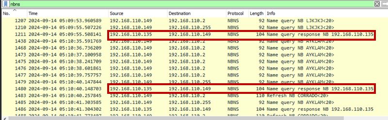 この問題では、ネットワークトラフィックを確認するため、その時点のトラフィックが記録されたpcapngファイルの調査に着手します。ホスト名とIPの対応関係を把握できるNBNS(NetBIOS Name Service)のトラフィックに注目することになります。ホスト名「LJKJKJ」と「AYKLAN」のName Queryに対して、いずれも192.168.110.135という単一のIPアドレスが応答している様子を確認します。複数のNetBIOS名に対して同一IPアドレスが応答することが、即ち攻撃であるとは断言できませんが、その可能性を疑ってさらなる調査をする意味はありそうです。