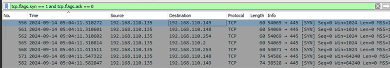 この問題ではネットワークスキャンを確認するため、SYNフラグに注目しました。ほぼ同一の時刻に複数のホストへ445/tcp宛のSYNパケットを送信している挙動が見られます。一般的に、短時間で複数のIPに対して同一ポートへSYNパケットを送信する動作は、ネットワークスキャンの典型的な特徴であるため、このタイミングが環境内で攻撃者が最初にネットワークスキャンを開始した時刻と考えられます。