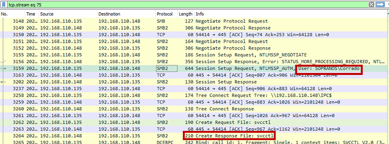 不審と思われる192.168.110.135が認証に成功し、何らかの操作が成功している通信を調査します。192.168.110.135がCreate Request Fileの送信及びCreate Responseを受信しているTCPストリームを確認すると、ユーザ「CORRADO」を使用して操作していることが分かります。そのことからユーザ「CORRADO」が侵害されている可能性が高いと考えられます。