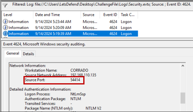 Q3. What source port was used to authenticate to the target workstation using the compromised account?