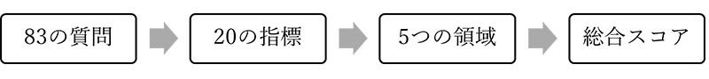 5つの領域の合計で各国の成熟度を0~100のスコアで評価し、順位付けする。
