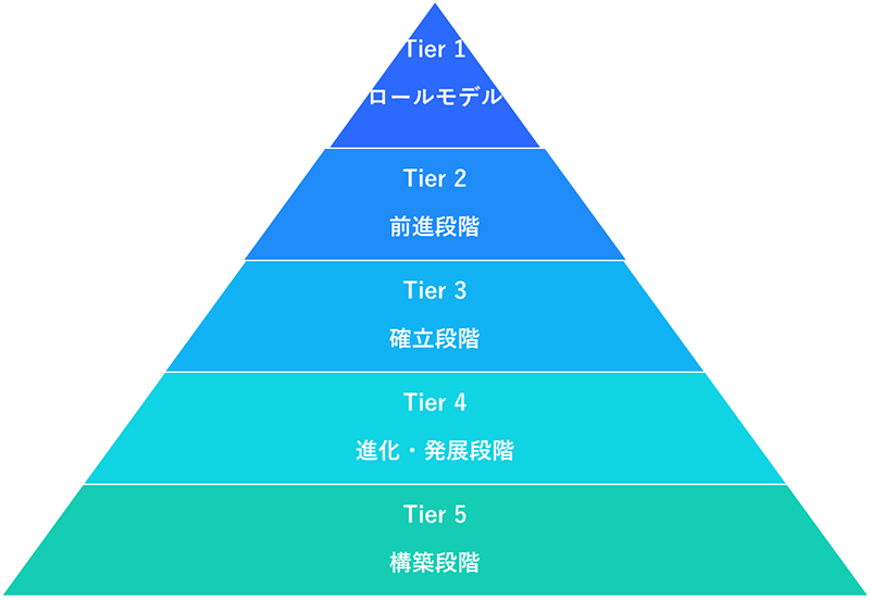 GCIでは総合スコア(0~100)に基づき、各国を5つのTierに分類します。これは国のサイバーセキュリティ成熟度を段階的に示すもので、政策立案や国際比較の指標として活用されます。