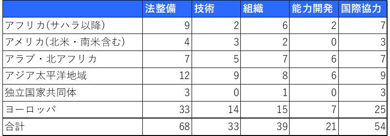 [2]の世界平均スコアは65.7/100と前回2020年のスコアである51.71/100から向上しています。これは各国がサイバーセキュリティの5つの領域にわたる施策を拡充してきた成果を反映しています。特に法制度の分野は多くの国で進展が見られ、国際条約に準拠した法律の整備が進んでいます。一方、能力開発や技術の分野は依然として多くの国で課題が残っており、教育・人材育成や標準化、インシデント対応能力の強化等が求められています。