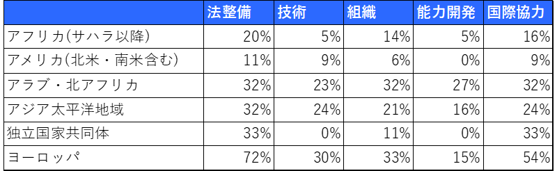 図3を見ると法整備(68カ国)や国際協力(54カ国)で満点を獲得している国が多い一方、能力開発(21カ国)は最も少なくなっています。法整備の分野では、国際的な標準や規範の整備が進み、多くの国が法的枠組を整備していることがわかります。こうした取り組みはサイバー犯罪やサイバー攻撃への対応を強化するための基盤として不可欠であり、各国が積極的に取り組んできた結果と言えます。一方、能力開発の分野では、専門人材の育成や教育体制の整備が難しく、満点の国が限られていることから、持続的な人材育成が世界的な課題であることが示唆されます。図4より地域別の割合を見ると、ヨーロッパは満点の国の割合が多く、特に法整備では70%と突出しており、国際連携においても50%となっています。これはNIS2などのEUを中心とした統一的な政策や国際連携の枠組みが機能していることの表れと考えられます。アラブ・北アフリカでは、他地域と比べて能力開発における満点の国の割合が1位となっています。これは地政学的要因や金銭目的の攻撃が多く、その対策として能力開発が進んでいる可能性があります。