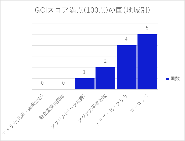 GCIの合計点が95-100点のTier1の国は、アメリカ合衆国、日本、フランス、ドイツ、シンガポール等含めて47カ国あります。その中でも5つの領域全てが満点(合計点100点)を獲得した国の一覧を図 5に、地域別にあらわしたものを図 6にまとめました。
