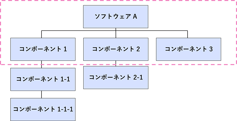 2つ目の「少なくとも最上位レベルの依存関係を網羅する」ですが、例えば図1のように「ソフトウェア A」をイメージしたとします。そして、ソフトウェアAから見て直接的に依存関係のあるコンポーネント1, 2, 3があったとします。このような場合では、「最上位レベルの依存関係を網羅する」はソフトウェアAとコンポーネント1, 2, 3との依存関係を把握し、記述することと解釈ができます。最上位レベルの依存関係は具体的に図示すると図1の破線枠内になります。