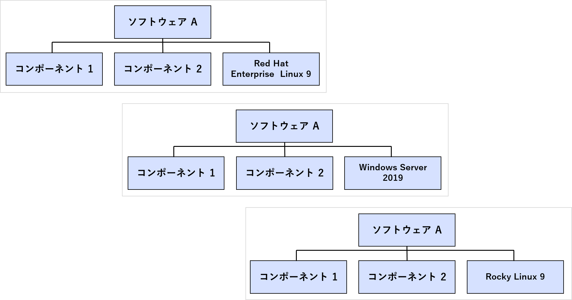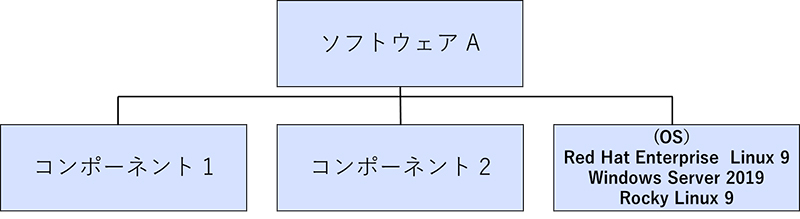 例えば、ソフトウェアAがRed Hat Enterprise Linux 9、 Windows Server 2019、 Rocky Linux 9をサポートしている場合、ソフトウェアAはこれらのOSに依存していると言えます。