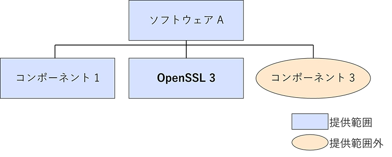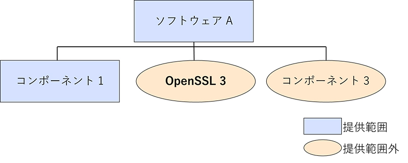 例えば、ソフトウェアAを動作させるための主要なコンポーネントとしてOpenSSLが必要だとします。 この時、OpenSSLをソフトウェアAに同梱して提供する場合、図9のようになり、同梱しない場合は図10のようになります。なお図中では、同梱して提供するものを「提供範囲」として記述しています。