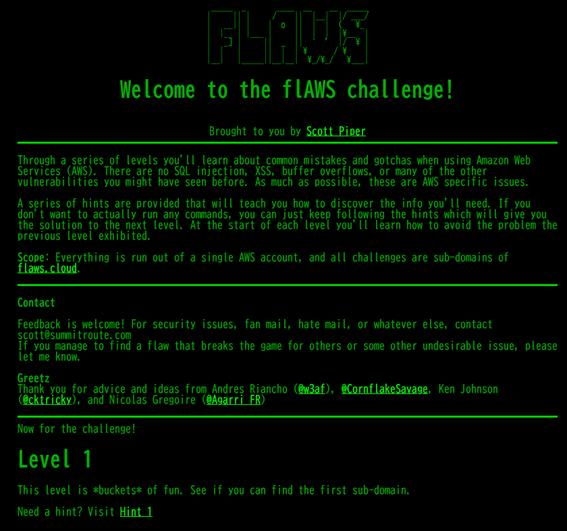 flAWSは米国のScott Piper氏が有志で作成したCTF形式の常設サイトで、AWS特有の問題(よくある設定ミスやそれに起因する脆弱性)を題材として取り扱っています。