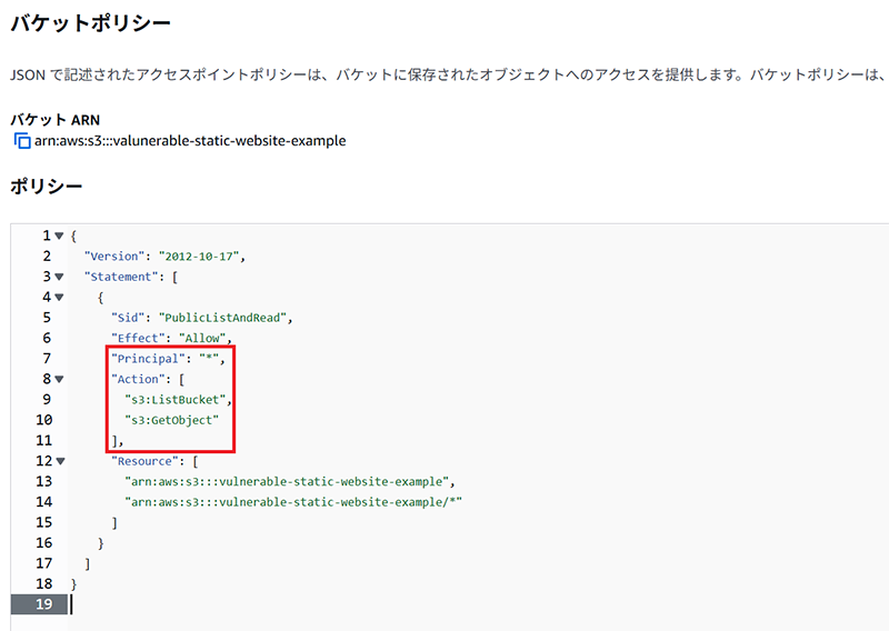 今回の問題サイトで機密情報が漏洩してしまった原因は、図4のようなバケットポリシーの設定を行っていたことであるといえます。具体的には、GetObjectとListObjectの2つのアクションをバケット内のすべてのオブジェクトに対して有効化してしまった点です。これにより第三者(Level 2においては任意のAWSアカウント)がオブジェクトの一覧を取得し、機密情報へのアクセスができるような公開設定になってしまいました。