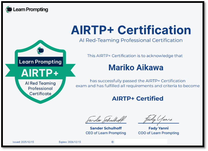 今回のトレーニング・資格試験を通して、AI Red Teamの重要性や役割やAI Red Teamとしての活動に必要なスキルを身に着けることができました。