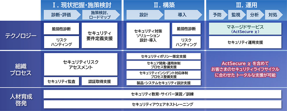 現状システムの診断・評価によるセキュリティリスクの見える化から、要件定義、Security By Designの考え方にもとづいたセキュアシステムの設計/構築、運用まで、ライフサイクルに合わせてトータルに支援します。