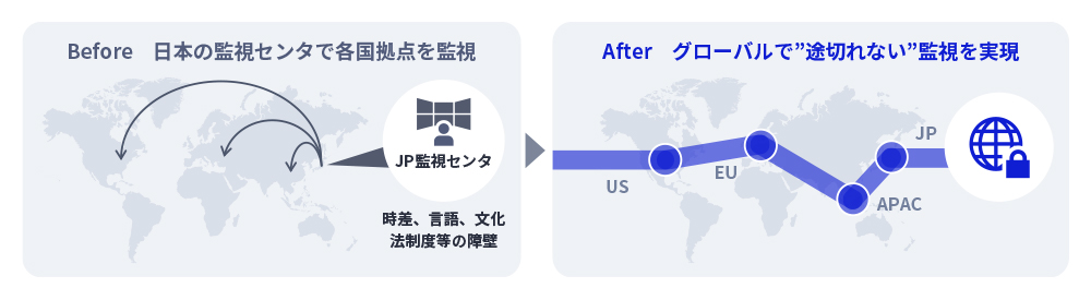 グローバル拠点に高度人材を配置し、24時間365日体制で監視を実行します。 途切れない監視と対応を基にインテリジェンス・AIを駆使し、各地法制度 / 言語 / 文化 / 時差といったグローバル特有課題を踏まえてグローバル全体で日本品質のセキュリティ対策を提供します。