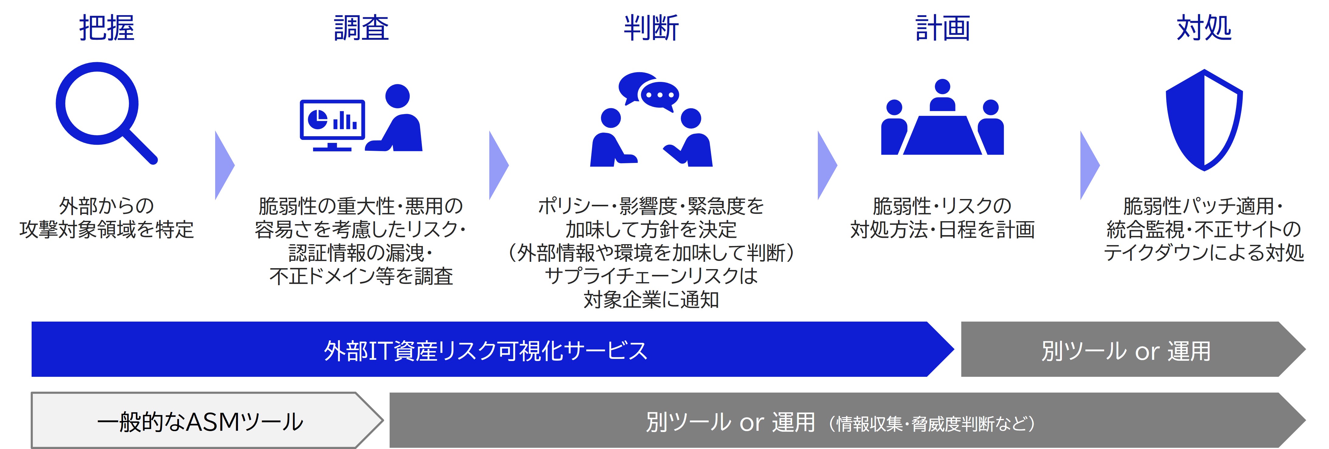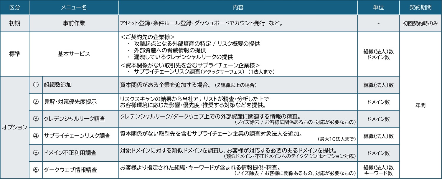 ASM(アタック・サーフェス・マネジメント)に加えて、資格情報の漏洩、組織に関するデジタルリスク(偽サイト / 類似ドメイン / ロゴ)も含めた可視化を行う事で、サイバー空間におけるプロアクティブな防御を包括的に支援します。