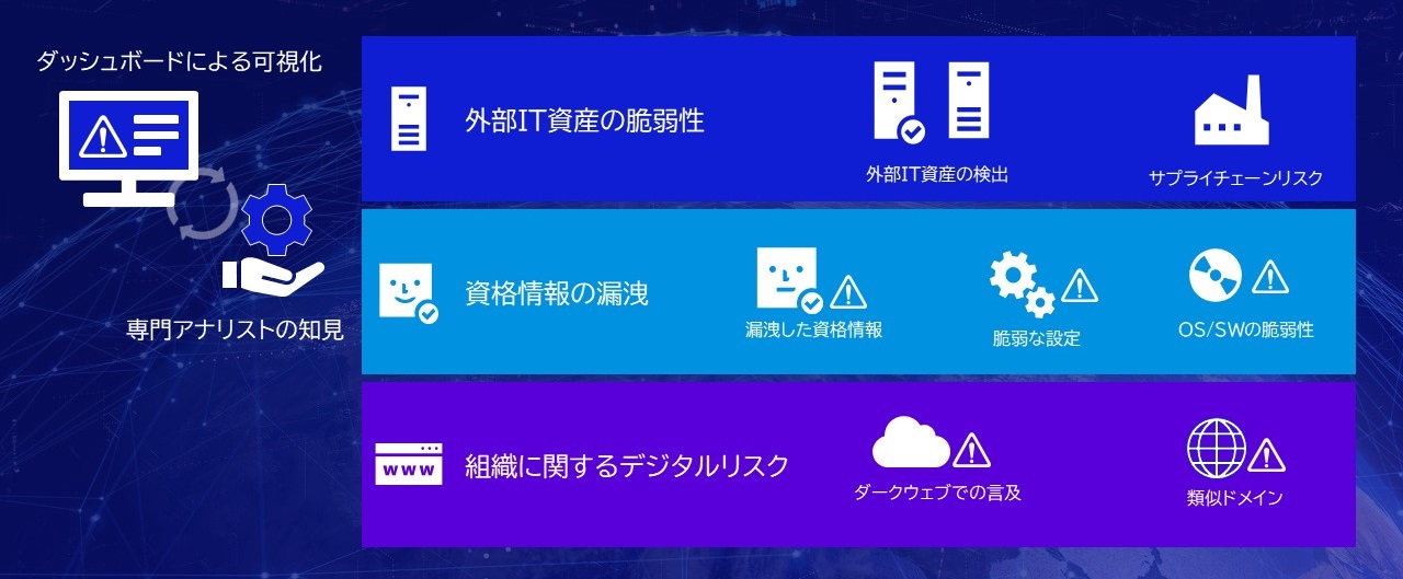 データドリブンサイバーセキュリティサービス企業を取り巻くセキュリティ上の脅威やリスクに対して、確かな情報源からインターネットにさらされている機器の脆弱性、ダークウェブに漏れている認証情報(ID/パスワード)の情報をダッシュボードで可視化し、専門アナリストの高度な知見によってサイバー空間におけるプロアクティブな防御を包括的に支援します。