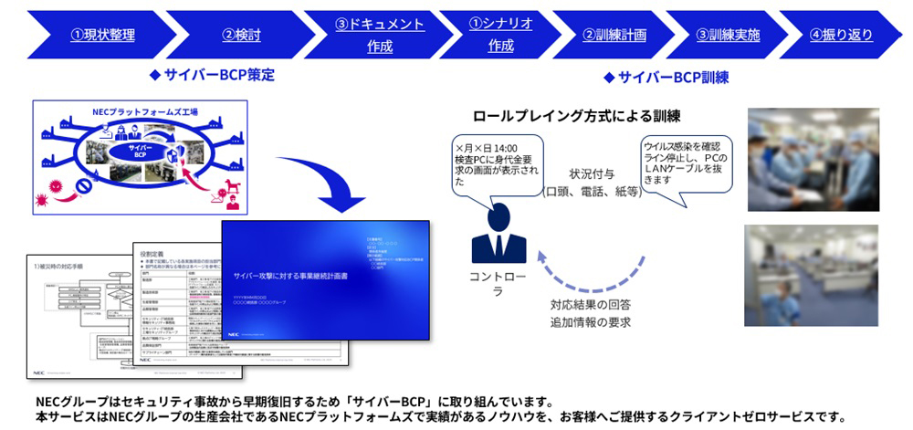 - NECグループ工場で実証済みのサイバーBCPドキュメント/訓練シナリオひな形を活用し、短期間で実務に効く体制・手順を整備します。