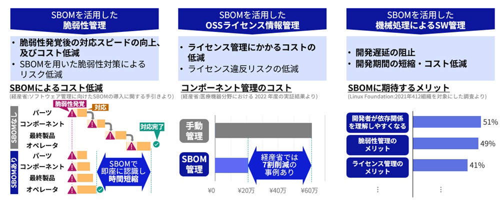 SBOM導入により、脆弱性対応期間の短縮やライセンス管理コストの低減・開発の効率化等が期待されます。