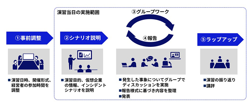 演習当日の進め方を事前に認識合わせします。当日、受講者はインシデントシナリオを確認した後、報告すべき内容をグループ内で話し合って作成していただきます。