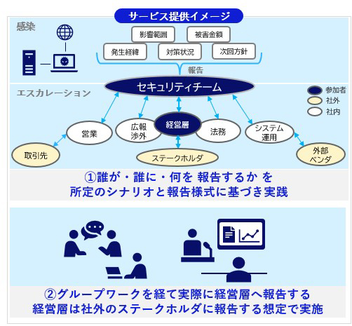 - 経営層も巻き込んだ演習:実際の経営者への報告、社外公表を想定した報告を演習内で実施します。