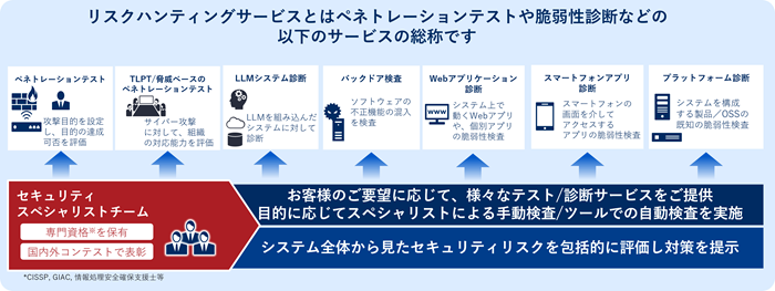 セキュリティスペシャリストチームが、ビジネスを考慮しながら脆弱性診断やペネトレーションテスト(侵入テスト)を行い、システム全体のリスク評価を行います。