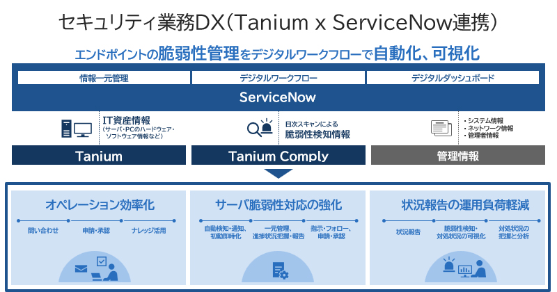 脆弱性の対処状況をTanium ComplyからServiceNow SecOps-VRに自動で反映し、進捗状況の把握と可視化を可能とすることで、管理者の運用負荷軽減を支援します。