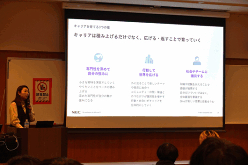 脆弱性診断やペネトレーションテストを通じたセキュア開発支援、さらにセキュリティ人材育成を専門とするNECのエンジニアが、「キャリアの育て方~サイバーセキュリティを仕事にするまでとその後の歩き方~」というテーマで、どのようにキャリアを選び、広げてきたのか、その体験をもとに学生に向けて紹介しました。