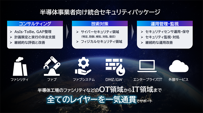 NECは、サイバー攻撃の高度化に伴いセキュリティ対策の強化が急務となっている半導体事業者を対象とした統合セキュリティパッケージを、2026年度より順次提供開始します。半導体工場のOT領域(ファシリティ、ファブ(注1)、ファブシステム(注2))、MESや業務システムなどのIT領域を包括的にカバーし、コンサルティングから設計・実装、運用・監視までを一気通貫で支援します。