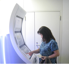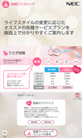 どちらのデモシナリオにおいても、無味乾燥な手続きに終わらないよう、画面のビジュアル面に力を入れ、明るく華やかな印象になるよう配慮しました。円弧を基本モチーフにして、ボタンを配置するなど、画面のイメージを統一すると共に、ダイナミックなアニメーションなども採り入れ、展示会場で目につきやすくわかりやすい画面をデザインしました。