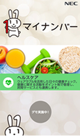 健康への取り組み状況などを把握できる「ヘルスケア」政府のマイナンバー広報用ロゴマークl「マイナちゃん」を活用し、アニメーションを駆使して親しみやすくわかりやすい画面遷移が展開する