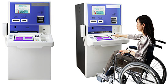 住民サービスの向上と交付業務の効率化を可能にした証明書自動交付機です。モニターや証明書取り出し口の配置を工夫して操作しやすくしたほか、車いすの蹴りこみスペースを確保、誰にでも利用しやすいユニバーサルデザインを目指しています。