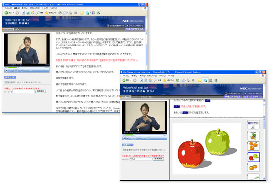 映像に説明テキストを連動させる事ができ、聞き取りにくい箇所や難しい用語もわかりやすくなり、見たいシーンや知りたいシーンを容易に検索してすばやく頭出し再生ができます。映像に連動したテキスト表示により、高齢者や音声が聴き取りにくいかたにも、やさしいコンテンツの提供が可能です。