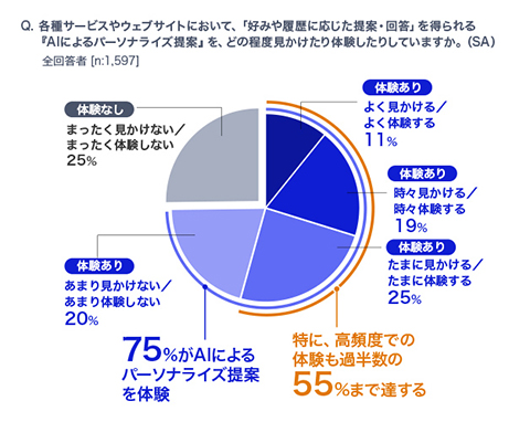 本調査では、AIによるパーソナライズ提案が75%の人に体験され、高頻度で利用している人も過半数に上ることが明らかになりました。この結果から、AIサービスが、生活の中に急速に浸透していることが伺えます。