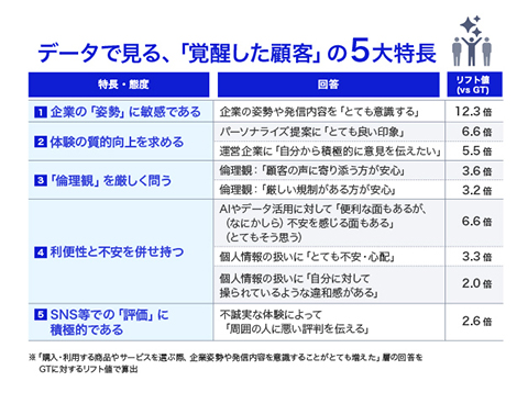 「覚醒した顧客*」は、製品だけでなく企業の倫理や姿勢の本質を見極めようとし、SNSなどを通じて積極的に発言し、企業の透明性や倫理的な対応を重視しています。
