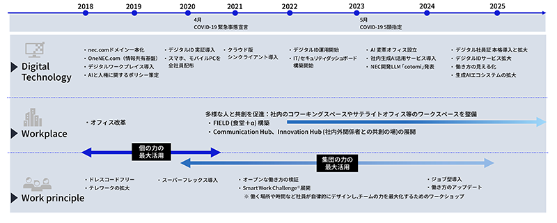 2021年度よりNECでは、働く場所や時間等を自律的にデザインし「チームとして」のパフォーマンスを最大化する「Smart Work2.0」に取り組んでいます。オフィスの進化を担う「Workplace」、新しい働き方の制度・ルール整備を行う「Work Principles」、デジタルの力を活かし新しい働き方を実現する「Digital Technology」の3つで推進しています。