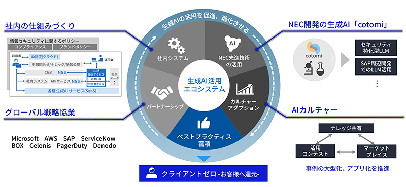 NECグループ社員が安全・安心に生成AIを業務活用するため、「NEC Generative AI Service」を短期間で構築し、APIを社内に公開することで、Teamsや様々な社内システムとも連携しています。また、「NEC Generative AI 変革オフィス」も立ち上げ、ユースケースや活用方法のナレッジを蓄積し、NEC社内のベストプラクティスをお客様へ還元しています。