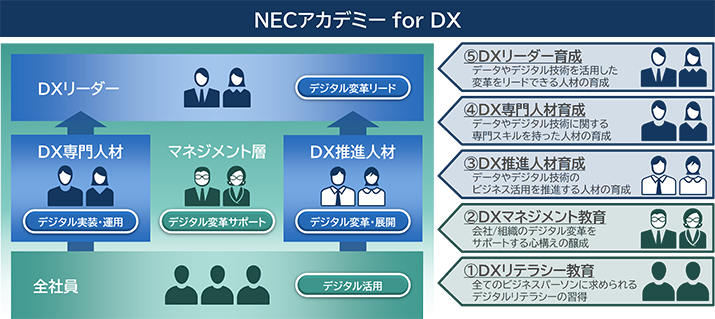 これまでNECは、グループ全体でデジタル人材育成を推進し、2021年には5,000人を突破。2025年までに10,000人に倍増させる計画です。こうしたNEC自身の取り組みのなかで培ってきた様々なメソッドを体系化し、サービスとして提供しています。