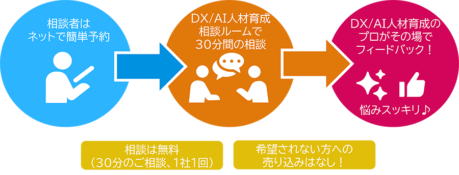 「研修を実施しても、現場で活かされない」、「経営層をどう説得すればいいか悩んでいる」、「自社に必要なスキルセットが定義できない」などDX/AI人材育成に関するお悩みをお申込者様毎に30分のお時間枠を確保し、知識、経験を有する弊社コンサルタントがDX人材育成業務に関するご相談を幅広く、無料で承ります。DX人材育成により、企業、官公庁さまのDX促進をご支援します。
