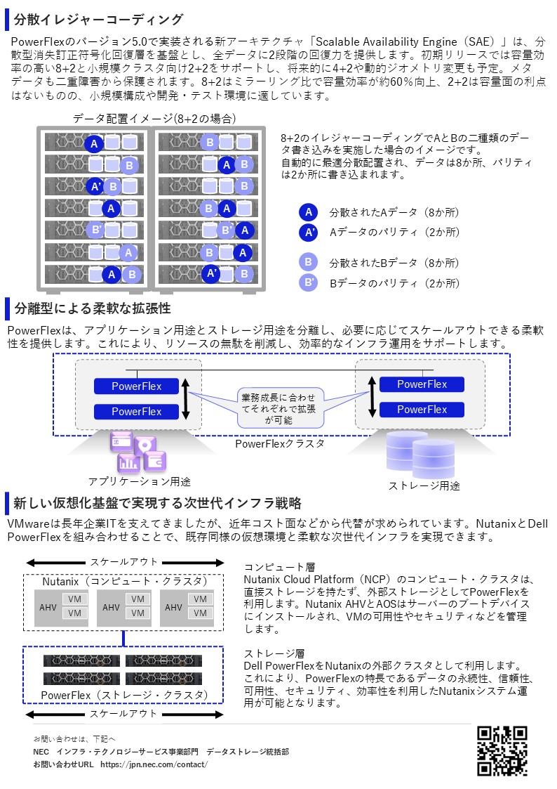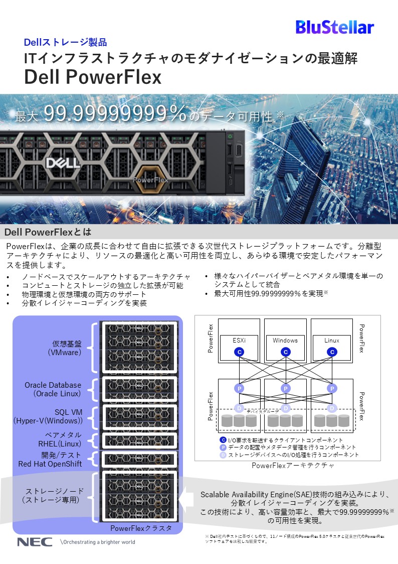 Dell PowerFlexは、分散アーキテクチャとScalable Availability Engine(SAE)により、柔軟な拡張性と高可用性(最大99.99999999%)を実現する次世代ストレージです。アプリケーション用途とストレージ用途を分離し、効率的な運用をサポートします。
