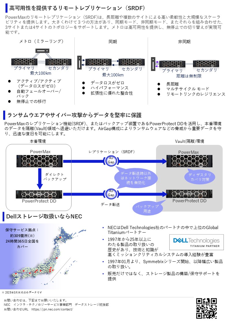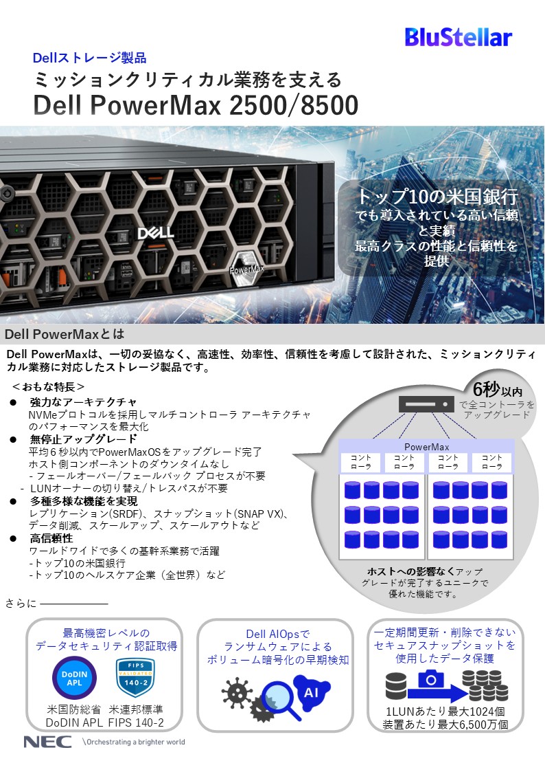 Dell PowerMaxは、ミッションクリティカル業務を支える高性能・高信頼性ストレージです。NVMe対応アーキテクチャとAIによる自動化、SRDFによる高速レプリケーション、ランサムウェア対策機能を備え、企業の重要データを安全かつ効率的に保護します。